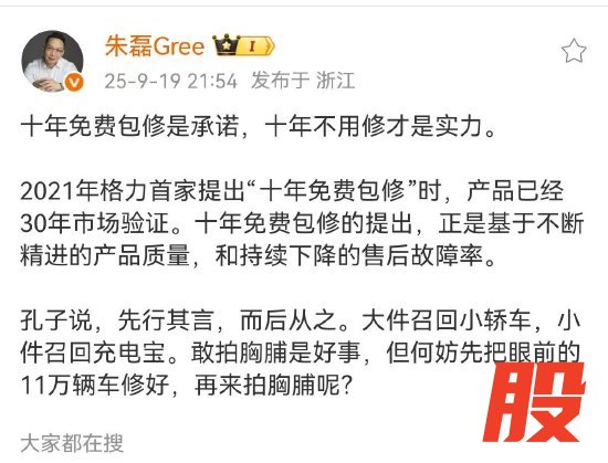 新浪科技讯 9月20日上午消息,格力电器市场总监朱磊发文谈及小米最新推出的“十年保修政策”时称:“十年免费包修是承诺,十年不用修才是实力。”