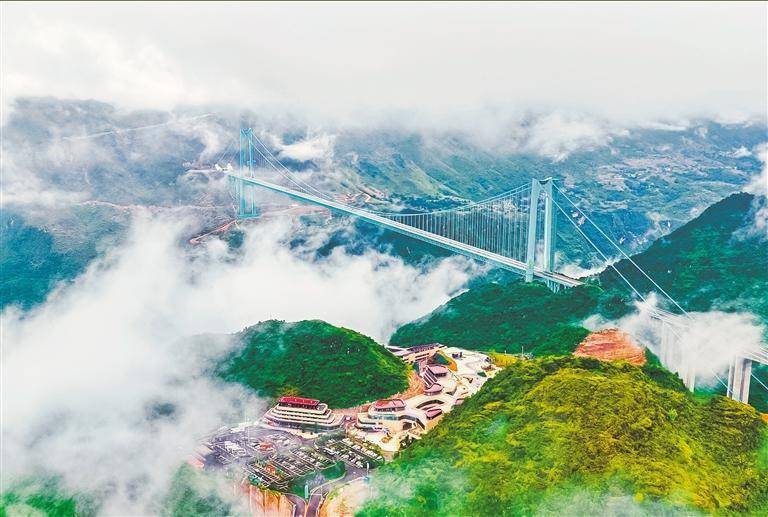 10月6日,花江峡谷大桥与云渡服务区在青山和云海中相映成景。除了基础设施,云渡服务区还整合了特色民宿、生态露营等多种业态。蒋唯微摄(中经视觉)