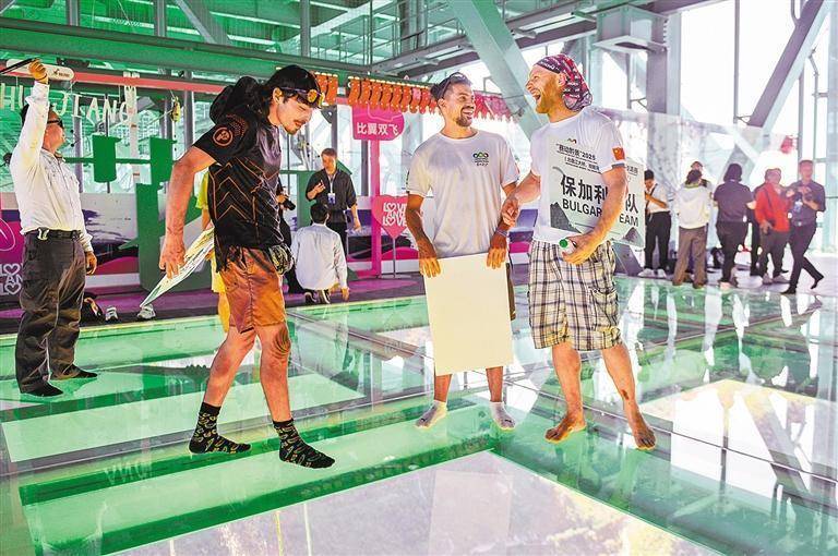 9月28日,“赛动黔景”2025高桥跳伞国际邀请赛在花江峡谷大桥落下帷幕。图为参赛队员在玻璃栈道俯瞰花江峡谷美景。刘朝富摄(中经视觉)